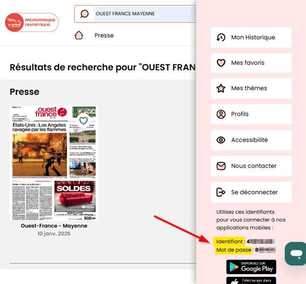- Une fois l’application installée, renseignez l’identifiant et le mot de passe que nous avons trouvé précédemment ou scanner le QRCode. Cela vous permet de lire la presse sans passer par notre site et directement depuis l’application.